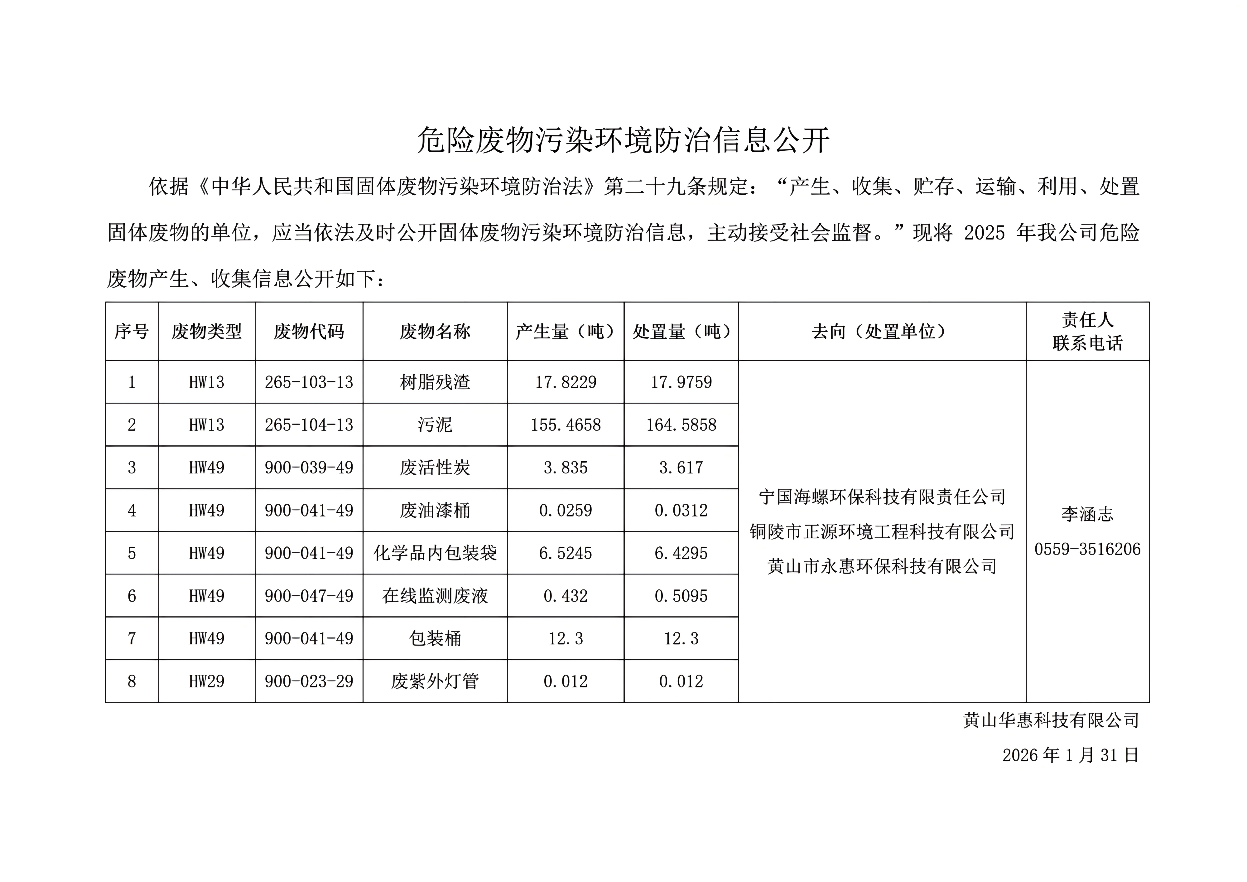 黃山華惠科技有限公司危險廢物污染防治信息公示